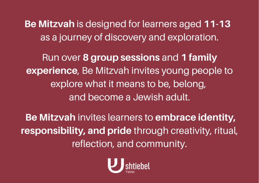 Be Mitzvah is designed for learners aged 11-13 as a journey of discovery and exploration. Run over 8 group sessions and 1 family experience, Be Mitzvah invites young people to explore what it means to be, belong, and become a Jewish adult. Be Mitzvah invites learners to embrace identity, responsibility, and pride through creativity, ritual, reflection, and community.